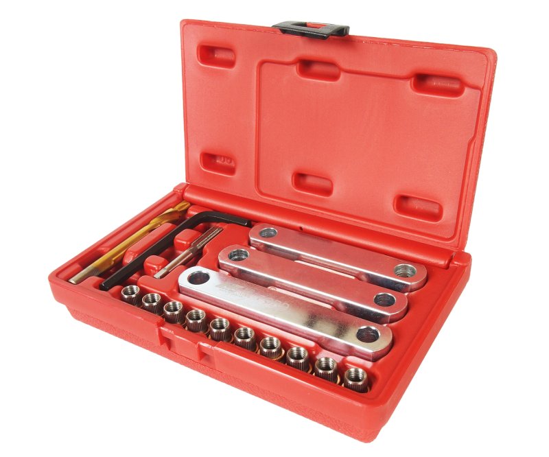 Применение данного набора обеспечивает быстрое восстановление поврежденной резьбы при помощи специальных приспособлений.