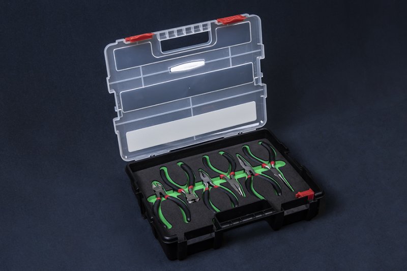 Набор поставляется в облегченном пластиковом кейсе. Этот кейс обладает уникальным свойством: в каждый набор вложены специальные пластиковые клипсы, с помощью которых, купив еще один кейс с другим набором инструмента, можно надежно соединить 2 кейса и получить отличную систему хранения, также удобную для дальнейшей эксплуатации и транспортировки. Ложемент EVA имеет высокую устойчивость к механическим воздействиям и влиянию ГСМ. Благодаря этому, он жестко фиксирует инструменты, быстро восстанавливает форму при деформации, не разлагается под действием масел и других веществ.