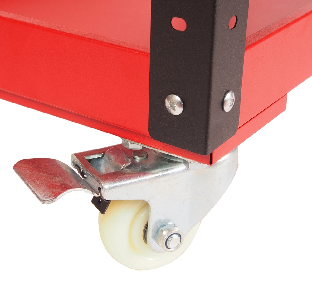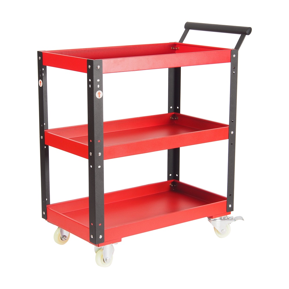 Инструментальная тележка (3 секции, на колесах, с открытым отсеком, красная) JTC-S1053 располагается на 4-х колесах с тормозом. В верхней части располагается удобная рукоятка. Трех полок достаточно для транспортировки ручного и электроинструмента, а также крепежа.