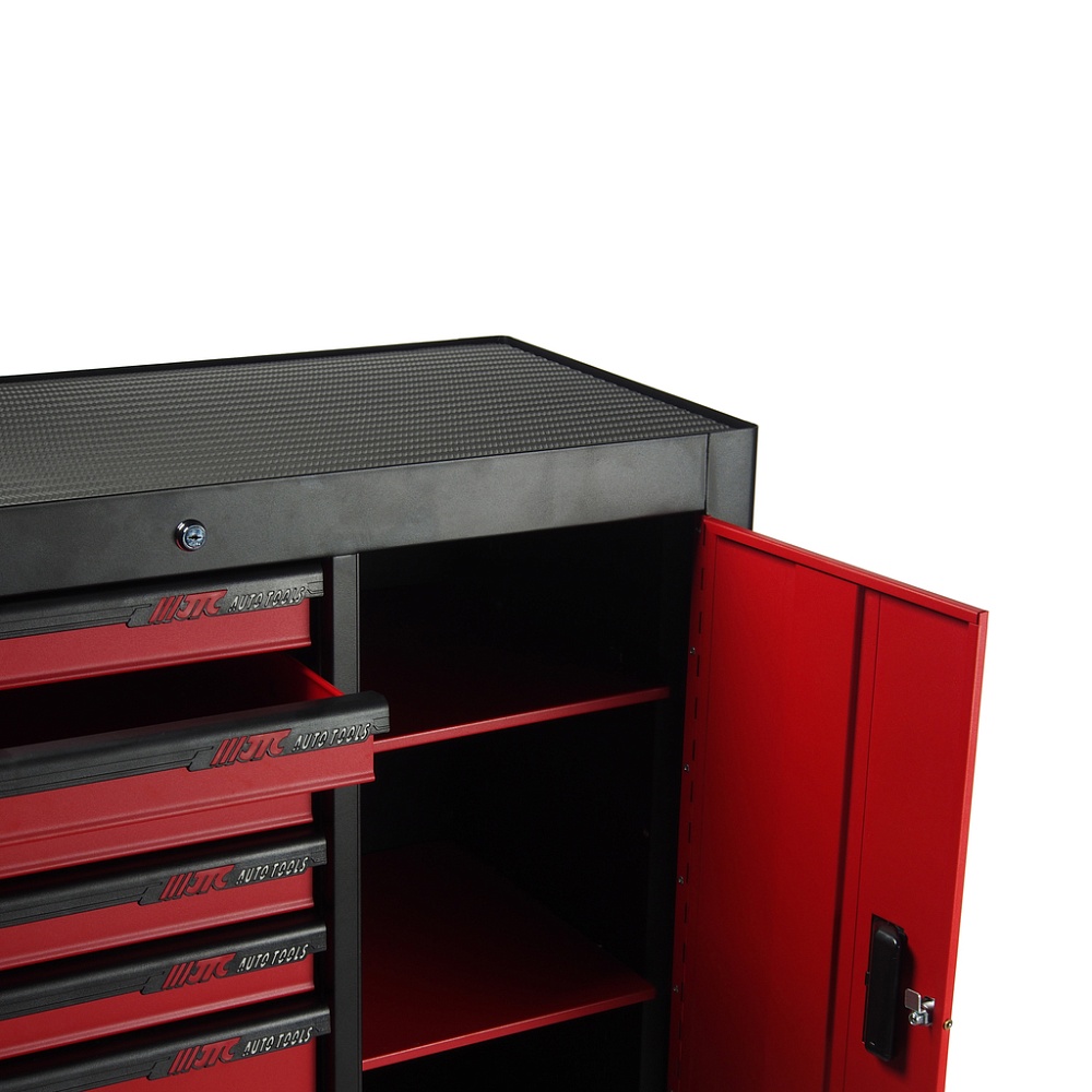 Тележка инструментальная (7 секций, красная, на колесах, с боковым ящиком) JTC S1067 предоставляет вместительное пространство для хранения инструмента: в наличии имеется семь ящиков различной высоты и две полки за дверцей. Для транспортировки можно пользоваться удобной транспортировочной рукояткой. Поворотные колеса имеют систему торможения и блокировки, которая позволяет свободно перемещать тележку и останавливать ее даже на поверхности с небольшим уклоном. Верхняя полка тележки покрыта специальным защитным материалом, который обеспечивает безопасность ЛКП изделия.