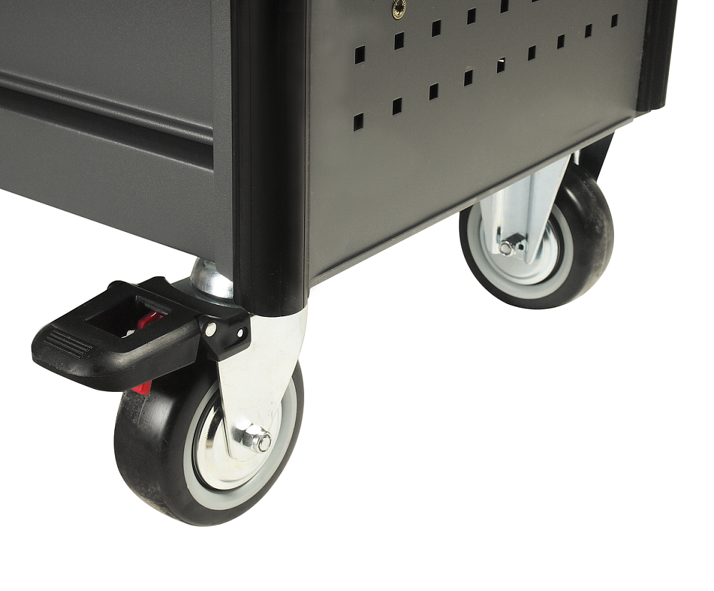 Корпус тележки оснащен защитными бортами, что сводит к минимуму риск повреждения оборудования и нанесение травм автомеханикам во время перемещения по СТО.