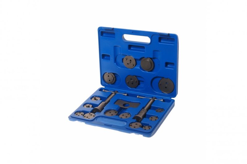 Комплект для развода поршней тормозных цилиндров дисковых тормозов применяется для упрощения работ по замене тормозных колодок. Количество предметов  18 Вес нетто    кг 2,4 Габариты в упаковке ДxШxВ    мм    330х260х54