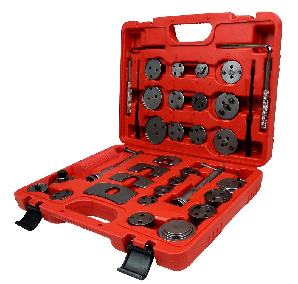 два нажимных шпинделя (с правой и левой резьбой) для возврата поршней в тормозные цилиндры суппортов; 24 адаптера поршня; 6 мм и 7 мм шестигранные ключи суппорта; 3 мм и 5 мм бородки; 4 специальные пластины для фиксации положения резьбового шпинделя в суппорте; емкость с жировой смазкой.