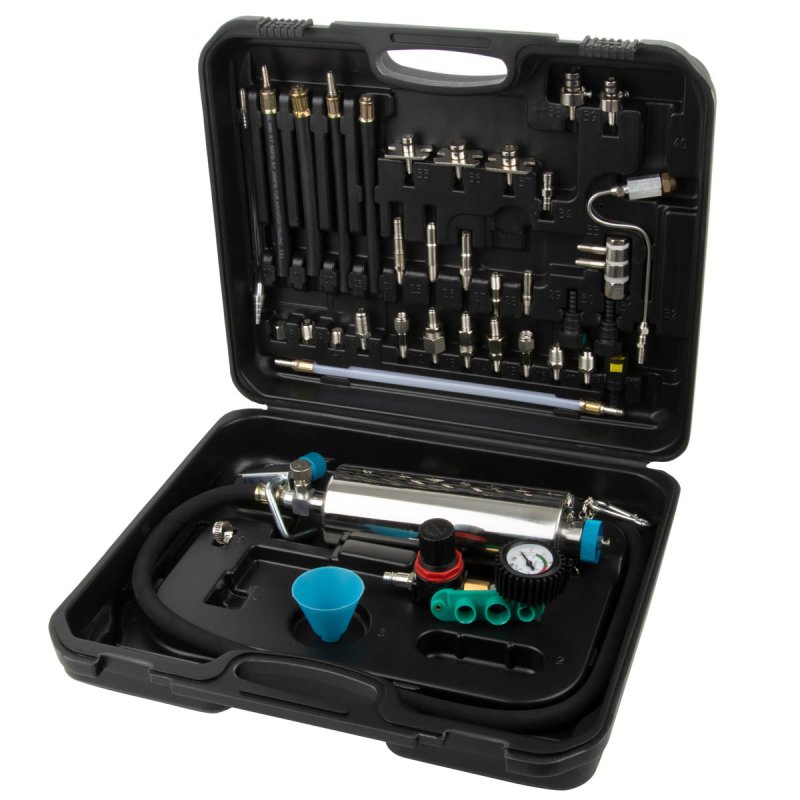Набор позволяет производить промывку дроссельного узла и впускного тракта БЕЗ снятия форсунок. Подходит как для бензиновых, так и дизельных двигателей. Подключается к рампе любых автомобилей и позволяет использовать любые промывочные жидкости. Переходники в комплекте – 35шт.