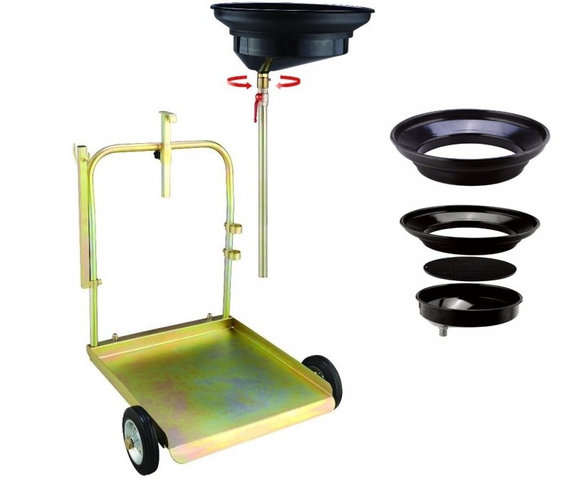 Для бочек 180-220 кг. Тележка оснащена подъемной ванной 10 л. с возможностью регулировки по высоте макс.1650 мм. Чаша (воронка) для сбора масла устанавливается на нужной для работы высоте при помощи зажимного приспособления и не позволяет разбрызгивать масло и техжидкости при сливе. Сетка для улавливания мелких деталей. Колёса 2 прямых + 2 поворотных. Масса 24,5 кг. Размеры тележки: (ДxШxВ) 710*780*873 мм