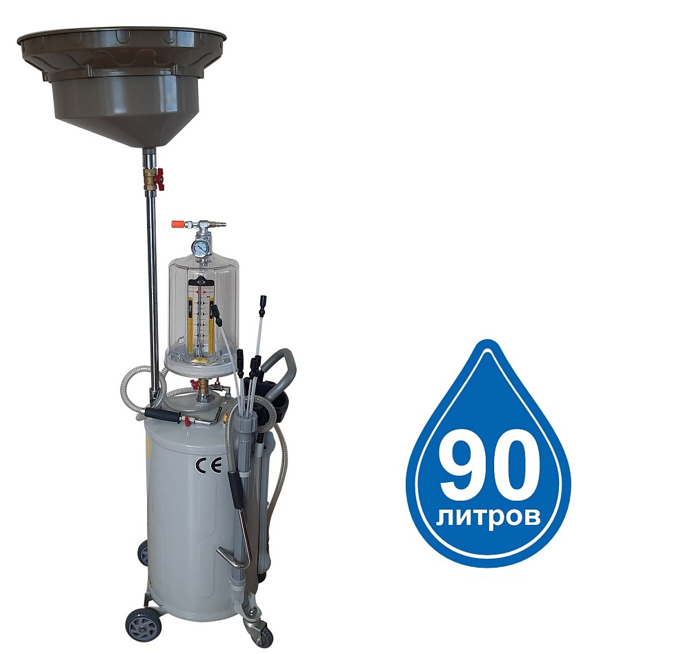 TS-2097 маслосборника для слива самотёком или вакуумной откачки масла и антифриза через щуп из ДВС, КПП и дифференциалов всех авто. В комплекте: Колба с особо прочным пластиком. Сливная чаша с сеткой для улавливания мелких деталей. Щупы гибкие 6 шт. Лоток для сливной пробки. Прозрачная трубка контроля в защитном кожухе. Металлические пистолеты для откачки масла. Быстросъёмный штуцер для пневмолинии. Сепаратор для выхода воздуха. Вмещает 90 л. = Бак 70л + колба 10 л. +  сливная воронка 10л.