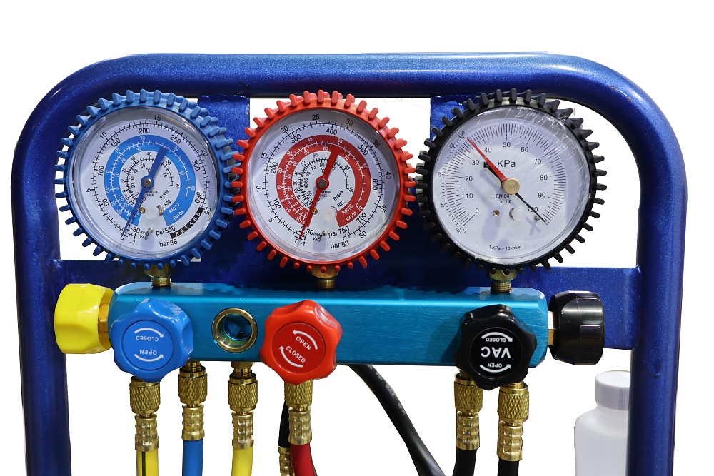 для обслуживания кондиционеров с фреоном R-134a. Функции: откачивание и очистка хладагента из системы, отделение и последующий сброс масла, вакуумирование системы, автоматическая заправка фреона и масла.